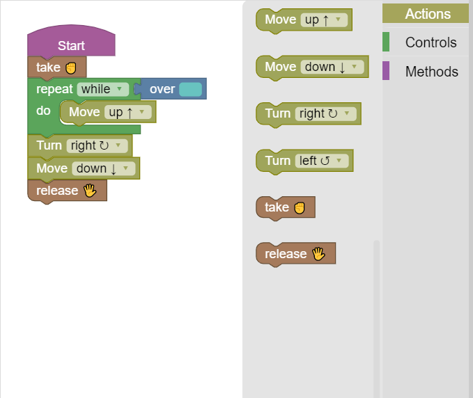 只要您装载了代码,您就可运行它, 使用下面的按键运行 / 暂停 游戏. 您可以使用时间行程调试一次运行一个 代码块 (下一个或上一个).